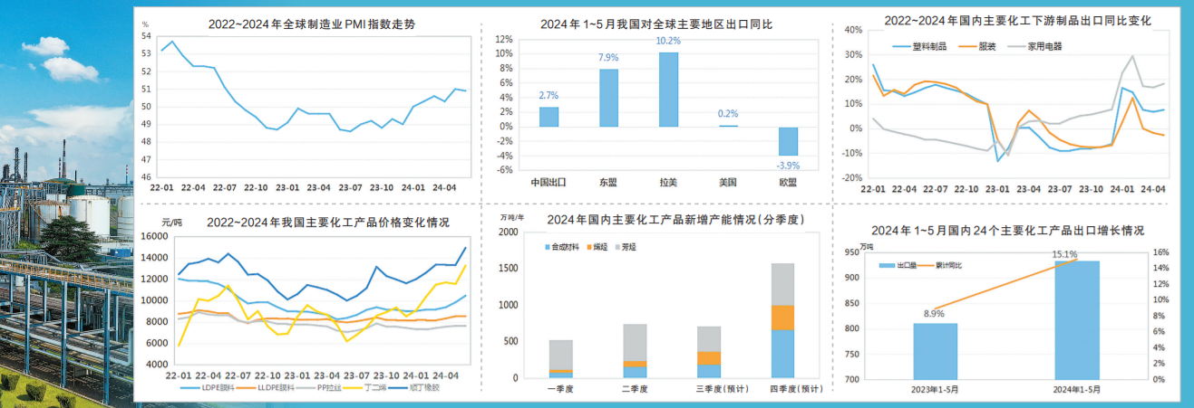 與此同時,全球制造業(yè)回暖,在海外補庫存需求的提振下,產(chǎn)品出口增長逐步恢復(fù)。6月,全球制造業(yè)PMI為50.9%,連續(xù)5個月位于擴張區(qū)間,美國多數(shù)行業(yè)進入補庫存階段,全球貿(mào)易景氣度明顯改善。今年1~5月,我國出口總值(以美元計)同比增長2.7%,增速較去年同期提升4.1個百分點,其中,對東盟、拉美等新興經(jīng)濟體的出口量高于對美國、歐盟等發(fā)達(dá)經(jīng)濟體的出口量,與化工產(chǎn)品相關(guān)的塑料制品、服裝、家用電器等產(chǎn)品出口觸底回升,24個主要化工產(chǎn)品累計出口932.8萬噸,同比增長15.1%。